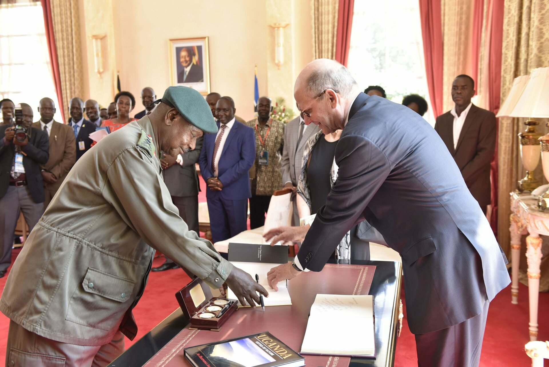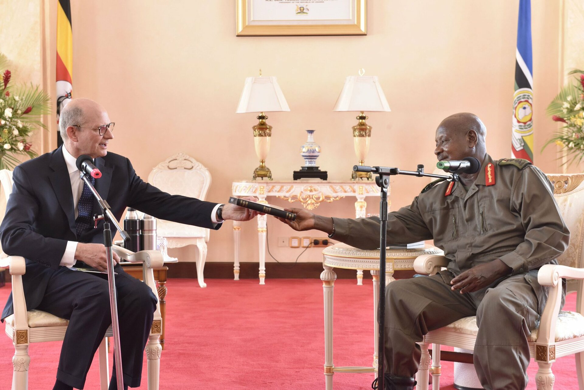 Museveni, riietudes rohelisse sõjaväevormi ja mustadesse saabastesse, jättis juba kohtumise alguses kõrvale tavapärase formaalsuse ning tervitas soojalt külalisi. Lisaks Ted Wilsonile olid kohal ka tema naine Nancy ning Ida- ja Kesk-Aafrika divisjoni delegatsioon.