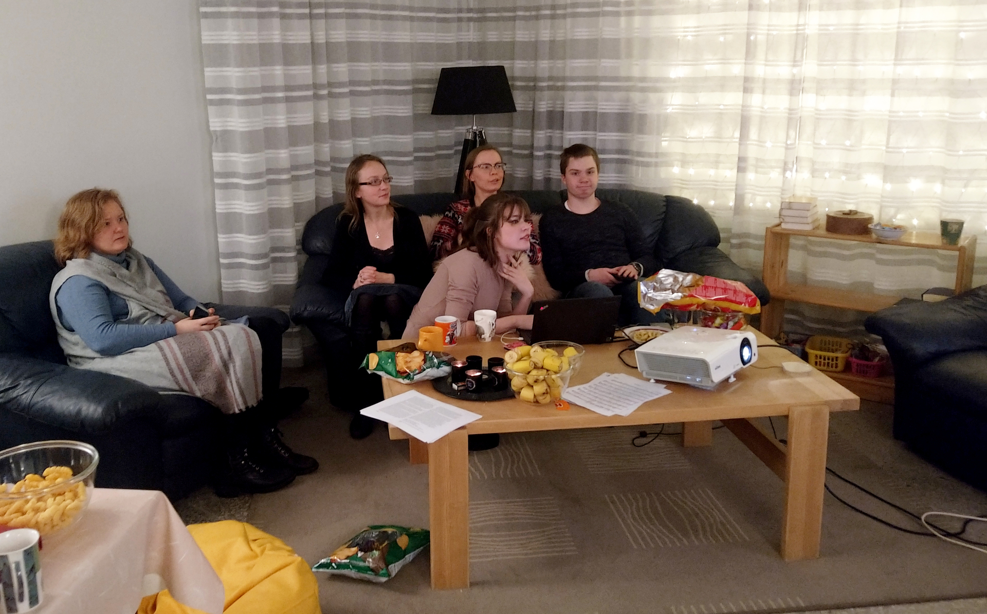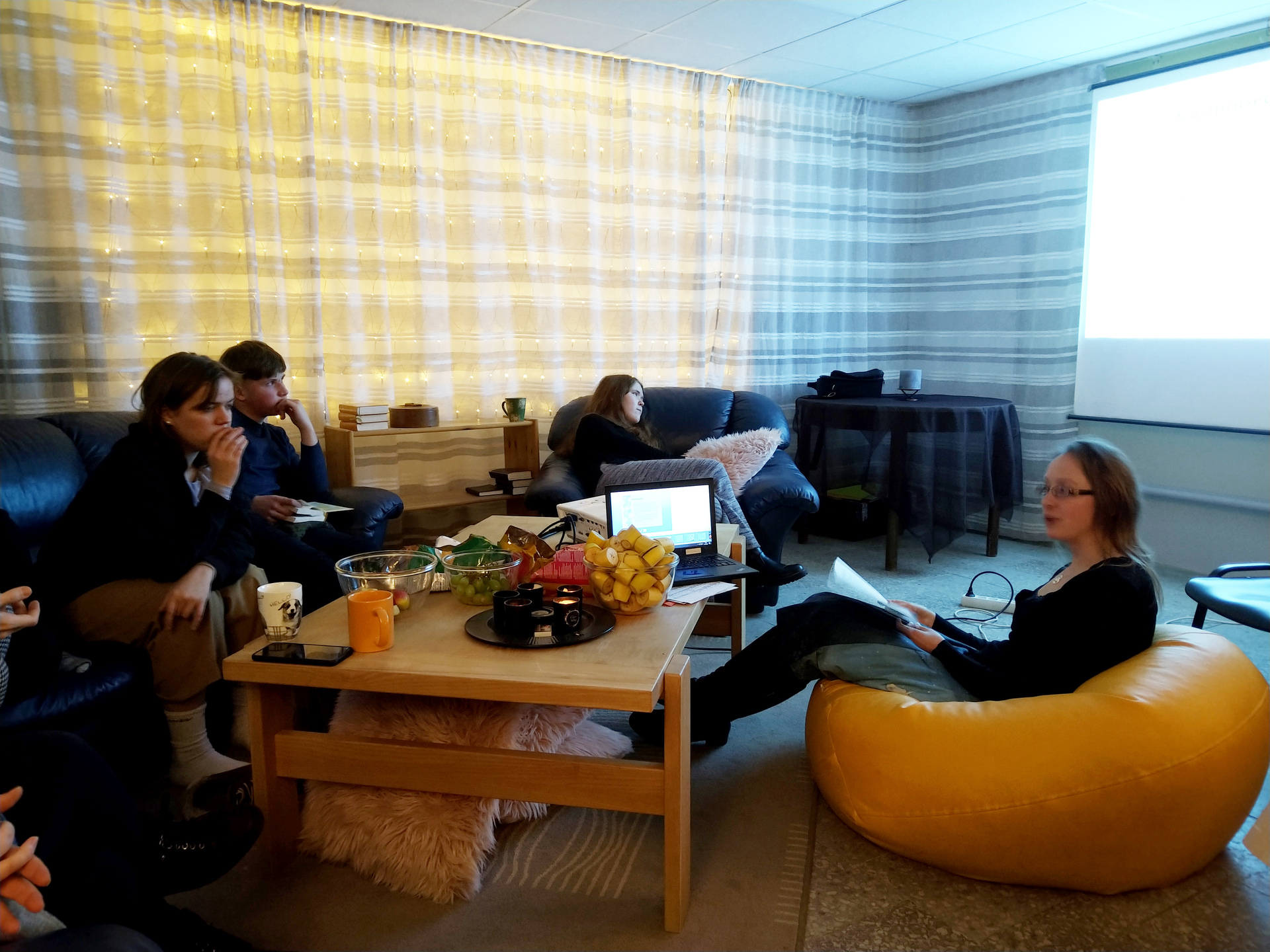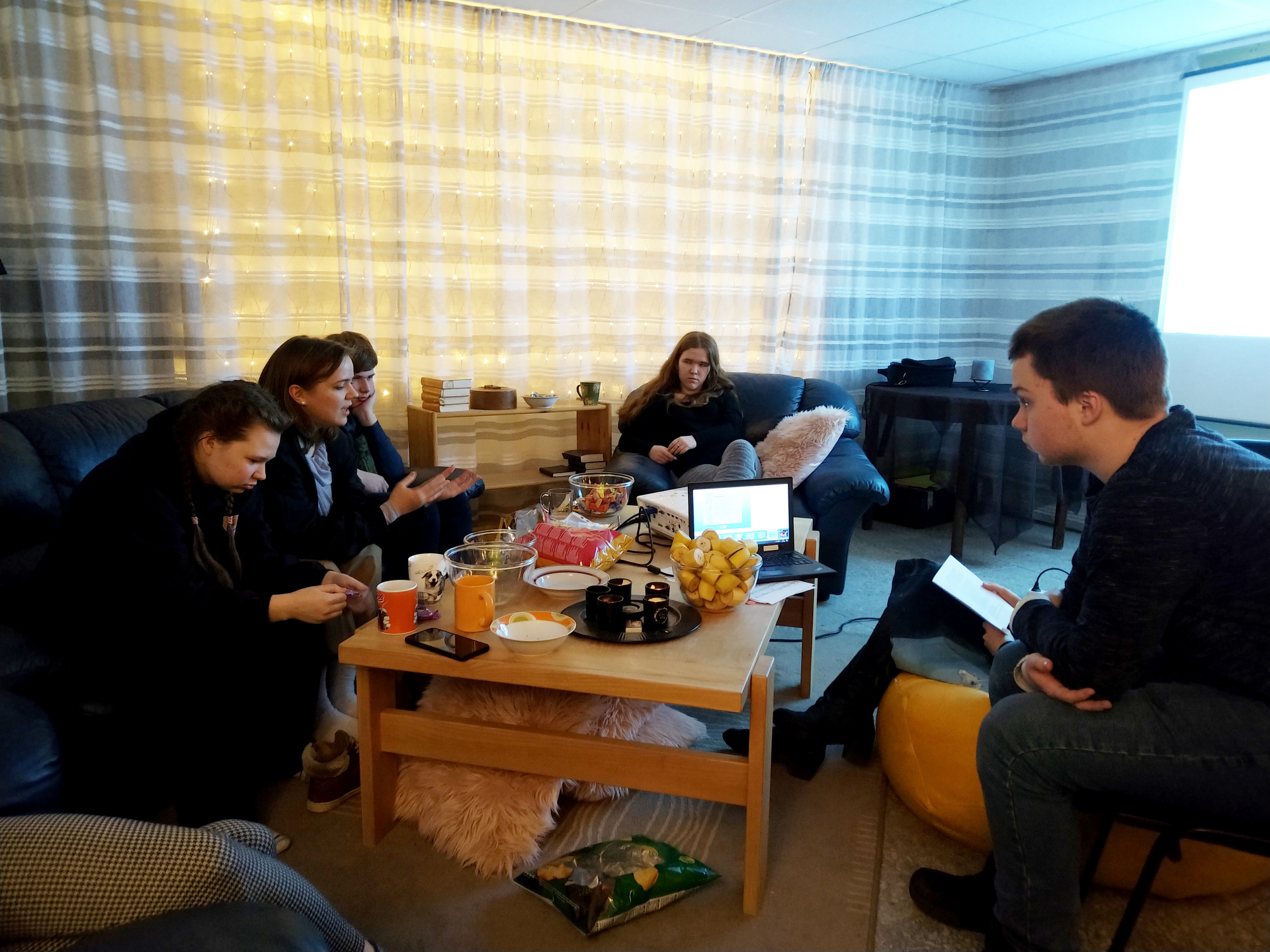Meie aastavahetuse üritusele tuli kokku 12 noort. Õhtu kõrghetkeks oli Ly Kaasiku vaimulik mõtisklus, mis rääkis lugudest ja kuidas panna ennast tegelaste kingadesse, aidates meil luua paralleele kirja pandud lugude ja enda igapäevaeluga. Õppisime vastama näiteks sellistele küsimustele: kuidas käituks mina sellises olukorras? ja millises situatsioonis käituksin mina samamoodi kui see tegelane loos?.