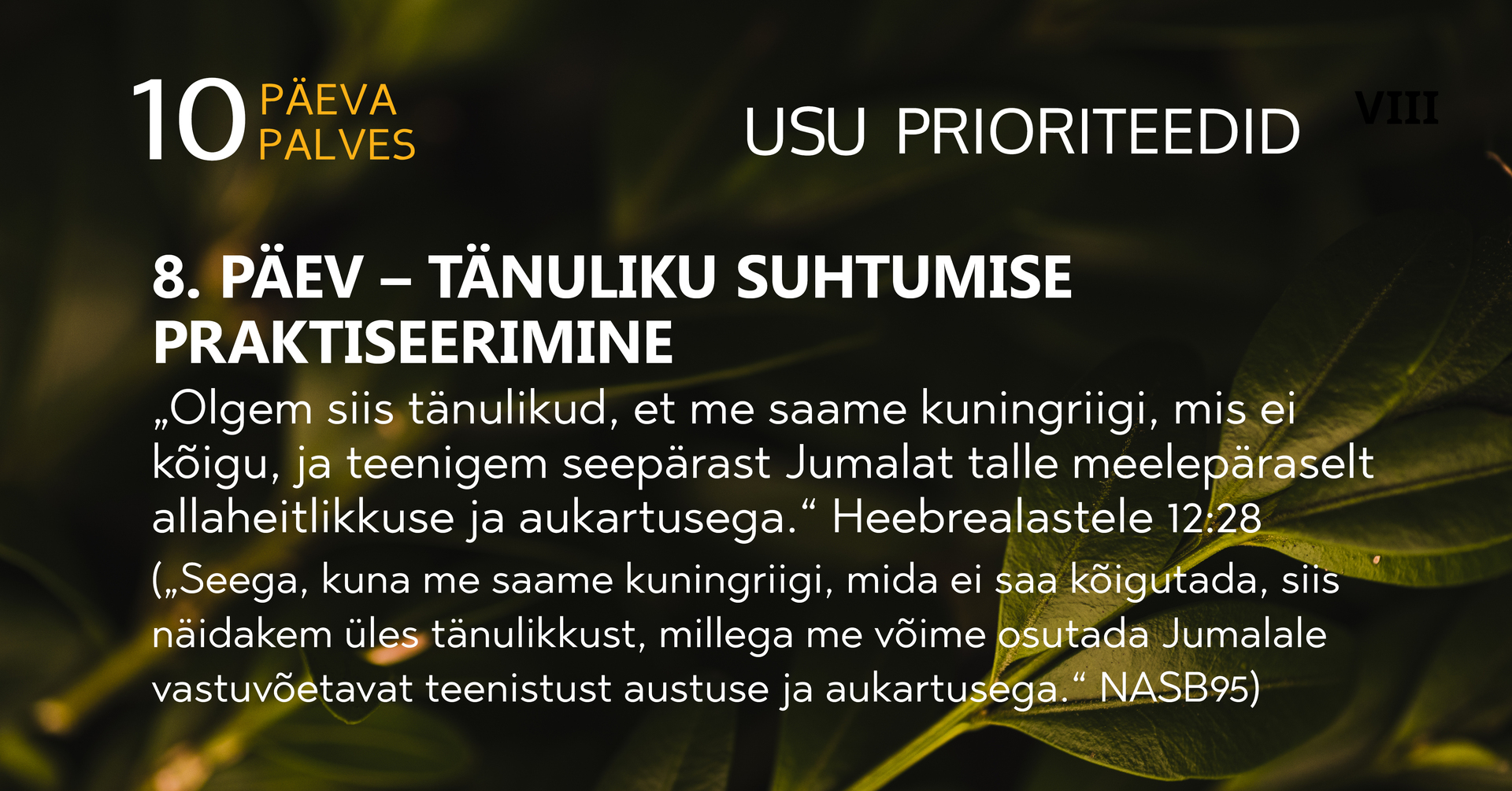 (“Seega, kuna me saame kuningriigi, mida ei saa kõigutada, siis näidakem üles tänulikkust, millega me võime osutada Jumalale vastuvõetavat teenistust austuse ja aukartusega.” NASB95)