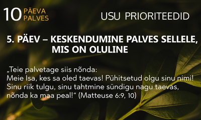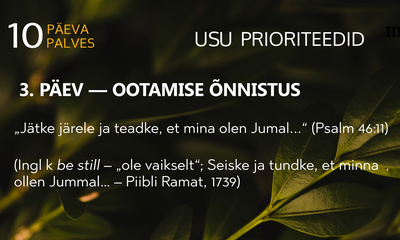 Jeesus, anname Sulle au ja austust, sest Sa oled püha ja auväärne. Täname Sind, et hingamispäev on päev, mil saame keskenduda Sinule, Sinu Sõnale, Sinu loomingule ja olla teistele õnnistuseks. Ometi oleme liiga sageli veetnud need pühad tunnid tühja jutu ja tegevustega, mis ei austa Sind. Palun anna meile andeks! Õpeta meid, kuidas muuta hingamispäev ülestõstvaks, ilusaks ja pühaks. Aamen.