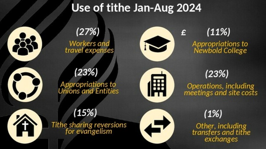 Jepuranović kirjeldas kümnise jaotamist: 27% töötajate toetuseks ja reisikuludeks, 23% eraldisteks unioonidele ja teistele üksustele, 15% evangelismiks mõeldud kümnise tagasimakseteks, 11% Newboldi kolledži eraldisteks, 23% tegevuseks, sealhulgas koosolekuteks ja tegevuskuludeks ning 1% „muudeks“ eesmärkideks, sealhulgas ülekanneteks ja kümnise vahetamiseks.