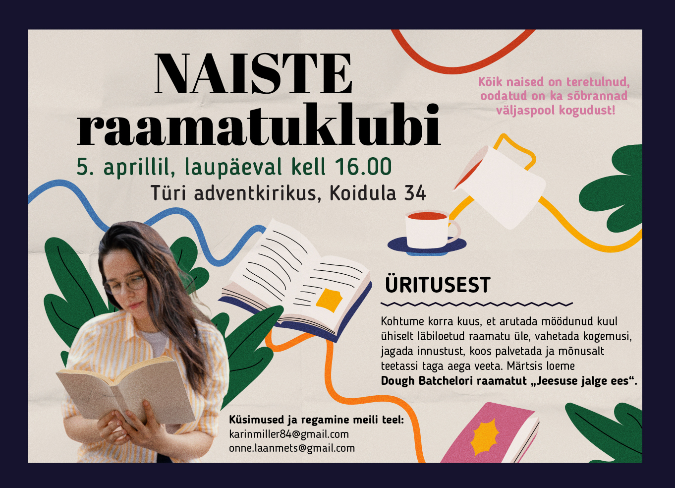 5. aprillil sai Türi kirikus kokku naiste raamatuklubi seltskond. Olime kuu aja jooksul lugenud Doug Batchelori raamatut „Jeesuse jalge ees“. Õnne Kivinurme ja Karin Milleri juhatusel arutasime läbi mõtted, mis seda raamatut lugedes olid tekkinud. Tõdesime, et kuigi see raamat oli ka varem loetud, siis uuesti lugedes avanesid selles veel sügavamad mõistmised.