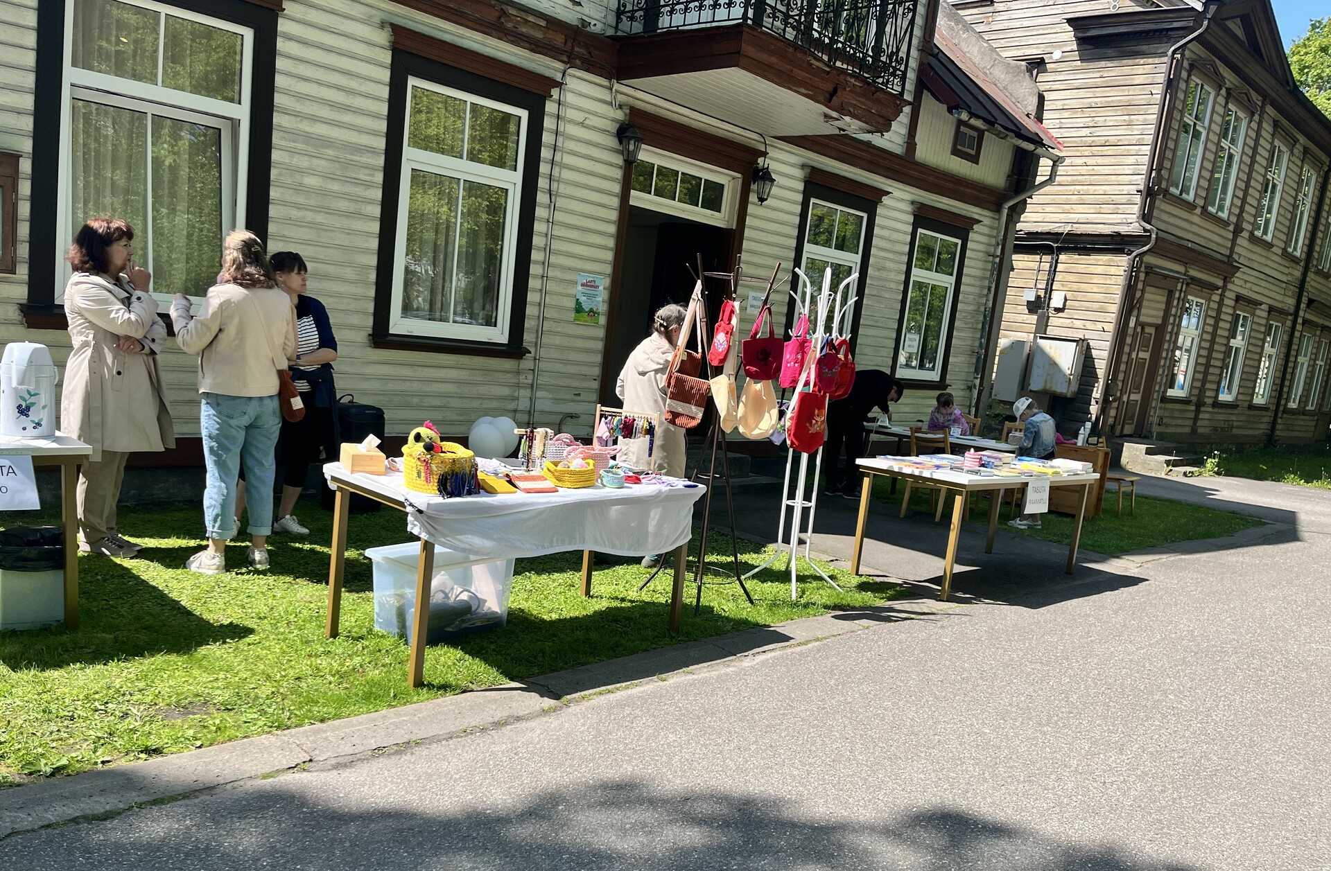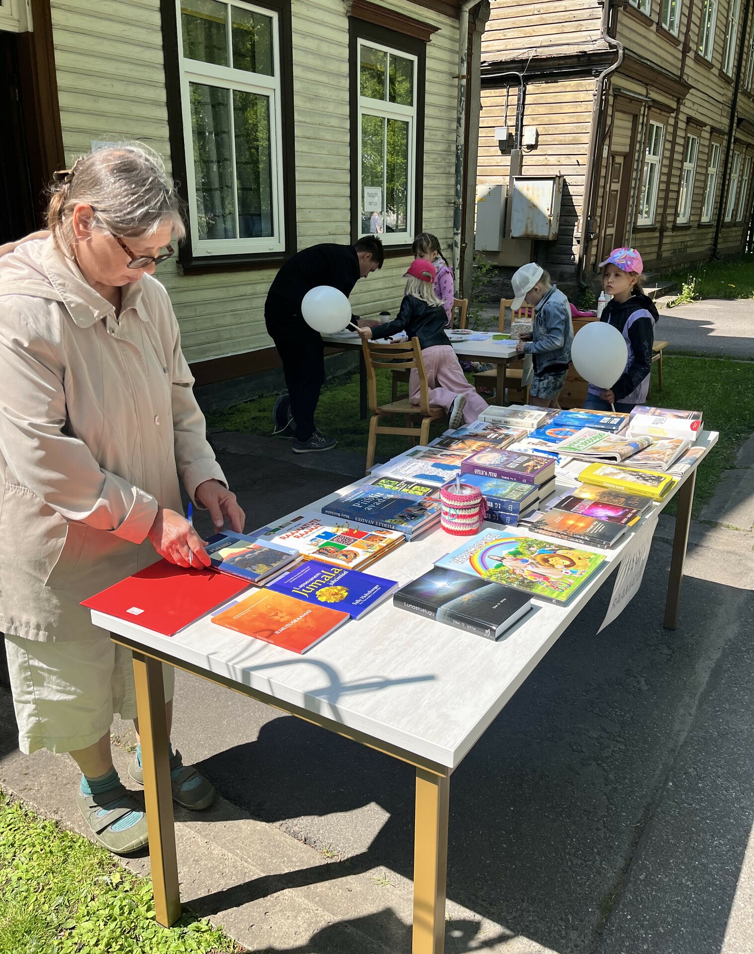 Täiskasvanutele pakkusime ka võimalust osta meie koguduse liikme käsitööd, sai osta nukuriideid, kotte, patsikumme ja helkureid, pakkusime ka tasuta massaaži, mis osutus eriti hinnatuks vanemaealiste seas. Nii mõnigi möödakäija leidis tee meie õues olevate laudade juurde just tänu sellele võimalusele ning lahkus tänulikuna rõõmsama meeleoluga ja raamatutega.