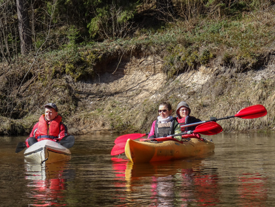 Ülejäänud pärastlõuna vehkisime Saesaare paisjärvel aerudega vastutuult. Hüdroelektrijaama juures tuli veelkord kõik sõiduvahendid veest välja tõsta ja allpool tagasi vette lasta. Hetked hiljem toimus ka matka ainuke sissekukkumine, seegi poolik. Aga mis sa teed, kui on vaja veidike jahutamist! Tuju aga sellest ainult tõusis. Olime ju ikkagi Taevaskojas. Vaatlesime sealseid liivapaljandeid, millest kõrgeim oli 38m. Arutlesime, kuidas küll need nimed sinna kõrgele kivi sisse on saanud ja millised need paljandid “dinosauruste ajal” välja võisid näha.