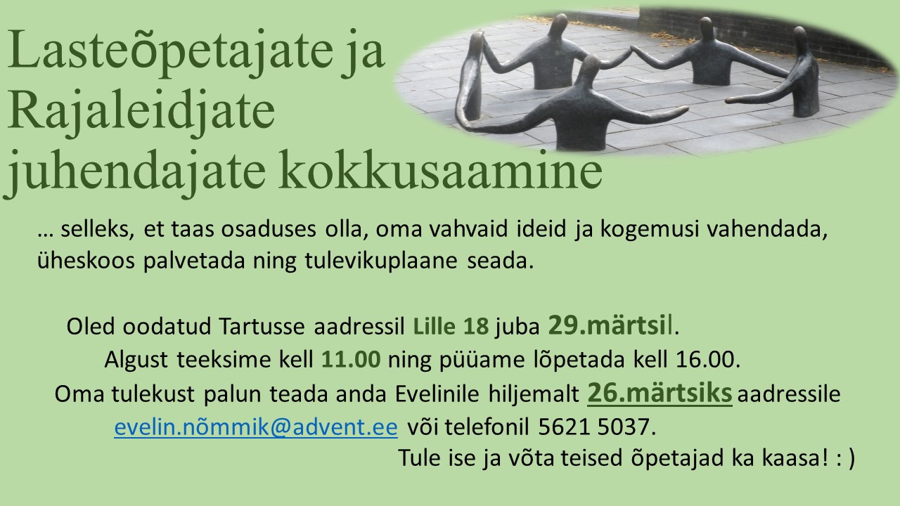 Tulekust teada anda aadressile evelin.nommik at advent.ee või telefonil 5621 5037 hiljemalt 26. märtsiks.